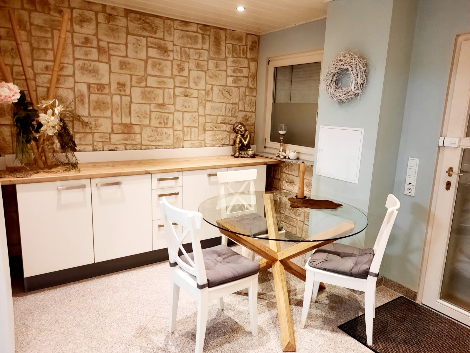 Komplett ausgestattet zum Kochen und Backen, von dort geht es auf die Terrasse und Garten.
